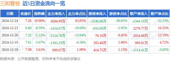 消息,三和管樁12月24日漲停收盤,收盤價7.26元。該股于9點30分漲停,未打開漲停,截止收盤封單資金為4073.45萬元,占其流通市值2.79%。