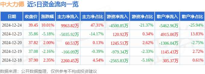 摘要: 消息,中大力德12月24日漲停收盤,收盤價39.45元。該股于9點25分漲停,未打開漲停,截止收盤封單資金為1.86億元,占其流通市值3.13%。12月24日的資金流向數(shù)據(jù)方面,