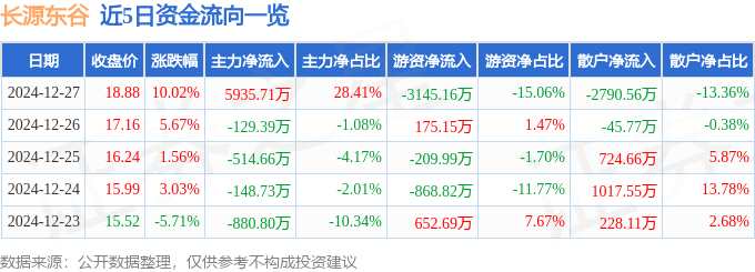 消息,長源東谷12月27日漲停收盤,收盤價18.88元。該股于9點30分漲停,1次打開漲停,截止收盤封單資金為4628.28萬元,占其流通市值0.76%。