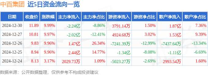 摘要: 消息,中百集團(tuán)12月30日漲停收盤(pán),收盤(pán)價(jià)11.89元。該股于9點(diǎn)42分漲停,8次打開(kāi)漲停,截止收盤(pán)封單資金為1.28億元,占其流通市值1.65%。12月30日的資金流向數(shù)據(jù)方面,
