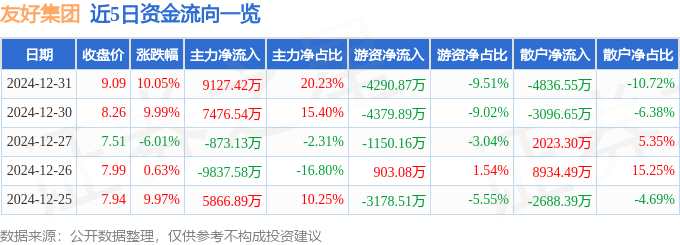 消息,友好集團(tuán)12月31日漲停收盤,收盤價9.09元。該股于9點(diǎn)36分漲停,1次打開漲停,截止收盤封單資金為3874.16萬元,占其流通市值1.37%。