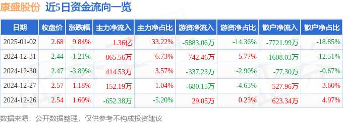 摘要: 消息,康盛股份1月2日漲停收盤,收盤價2.68元。該股于9點30分漲停,3次打開漲停,截止收盤封單資金為1482.07萬元,占其流通市值0.49%。1月2日的資金流向數(shù)據方面,