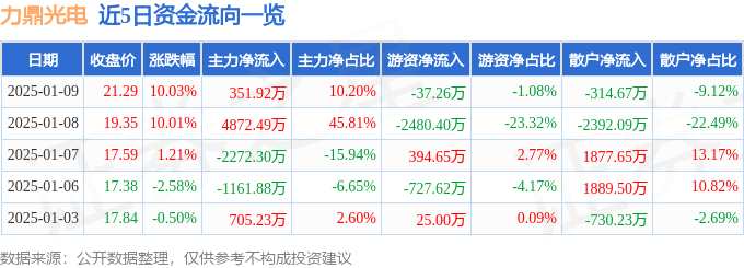 消息,力鼎光電1月9日漲停收盤,收盤價21.29元。該股于9點25分漲停,未打開漲停,截止收盤封單資金為8459.16萬元,占其流通市值0.98%。