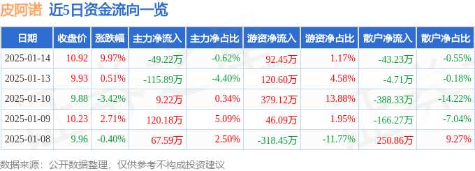 摘要: 消息,皮阿諾1月14日漲停收盤,收盤價10.92元。該股于9點25分漲停,1次打開漲停,截止收盤封單資金為2059.08萬元,占其流通市值1.42%。1月14日的資金流向數(shù)據(jù)方面,