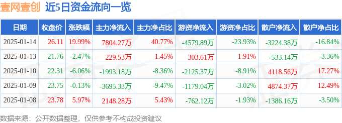 1月14日的資金流向數據方面,主力資金凈流入7804.27萬元,占總成交額40.77%,游資資金凈流出4579.89萬元,占總成交額23.93%,散戶資金凈流出3224.38萬元,占總成交額16.84%。