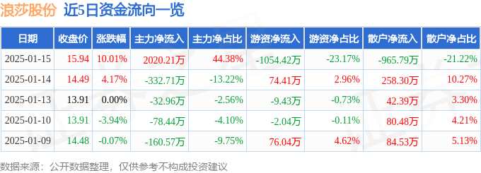 消息,浪莎股份1月15日漲停收盤(pán),收盤(pán)價(jià)15.94元。該股于9點(diǎn)30分漲停,未打開(kāi)漲停,截止收盤(pán)封單資金為1953.77萬(wàn)元,占其流通市值1.26%。