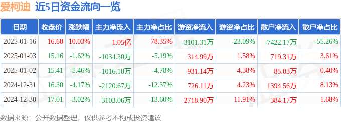 摘要: 消息,愛(ài)柯迪1月16日漲停收盤(pán),收盤(pán)價(jià)16.68元。該股于9點(diǎn)25分漲停,未打開(kāi)漲停,截止收盤(pán)封單資金為3.02億元,占其流通市值1.85%。1月16日的資金流向數(shù)據(jù)方面,主力資金凈流入1.05億元,