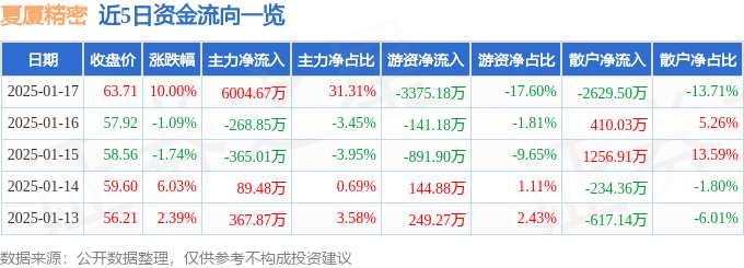 消息,夏廈精密1月17日漲停收盤,收盤價63.71元。該股于9點33分漲停,3次打開漲停,截止收盤封單資金為2699.39萬元,占其流通市值2.73%。