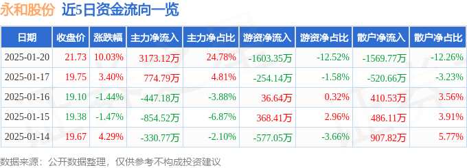 消息,永和股份1月20日漲停收盤,收盤價21.73元。該股于9點25分漲停,未打開漲停,截止收盤封單資金為5223.27萬元,占其流通市值0.63%。