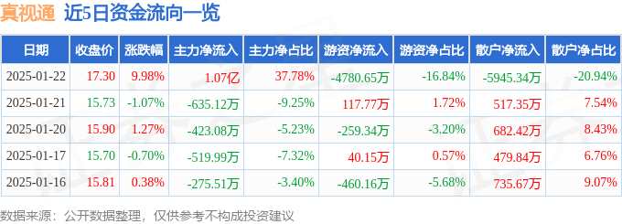 摘要: 消息,真視通1月22日漲停收盤,收盤價17.3元。該股于9點(diǎn)34分漲停,2次打開漲停,截止收盤封單資金為4387.92萬元,占其流通市值1.45%。1月22日的資金流向數(shù)據(jù)方面,