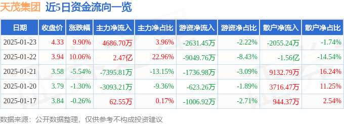 消息,天茂集團1月23日漲停收盤,收盤價4.33元。該股于9點25分漲停,4次打開漲停,截止收盤封單資金為1.28億元,占其流通市值0.65%。