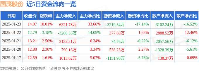 消息,國(guó)茂股份1月23日漲停收盤,收盤價(jià)14.07元。該股于9點(diǎn)30分漲停,未打開漲停,截止收盤封單資金為9449.11萬元,占其流通市值1.02%。