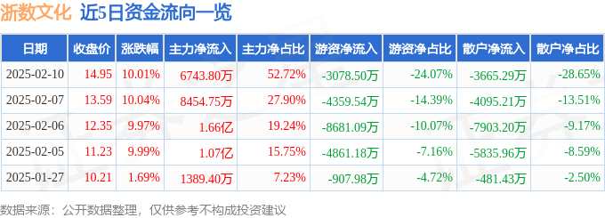 消息,浙數(shù)文化2月10日漲停收盤(pán),收盤(pán)價(jià)14.95元。該股于9點(diǎn)25分漲停,未打開(kāi)漲停,截止收盤(pán)封單資金為3.28億元,占其流通市值1.73%。