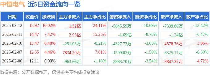 消息,中恒電氣2月12日漲停收盤(pán),收盤(pán)價(jià)15.92元。該股于9點(diǎn)30分漲停,未打開(kāi)漲停,截止收盤(pán)封單資金為2.46億元,占其流通市值2.77%。