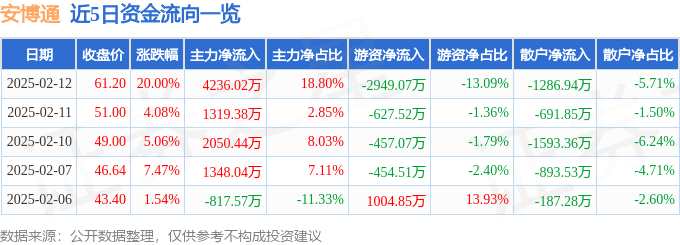 消息,安博通2月12日漲停收盤,收盤價61.2元。該股于9點25分漲停,未打開漲停,截止收盤封單資金為558.97萬元,占其流通市值0.12%。