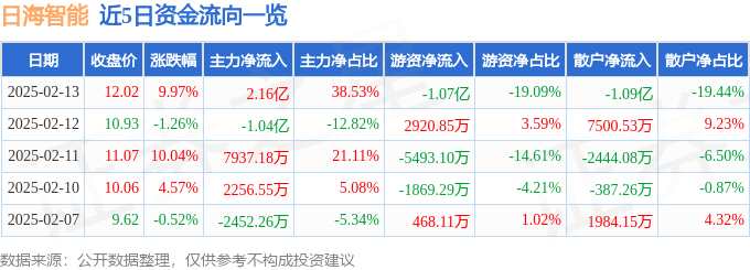 消息,日海智能2月13日漲停收盤,收盤價(jià)12.02元。該股于9點(diǎn)30分漲停,1次打開漲停,截止收盤封單資金為7428.95萬(wàn)元,占其流通市值1.65%。