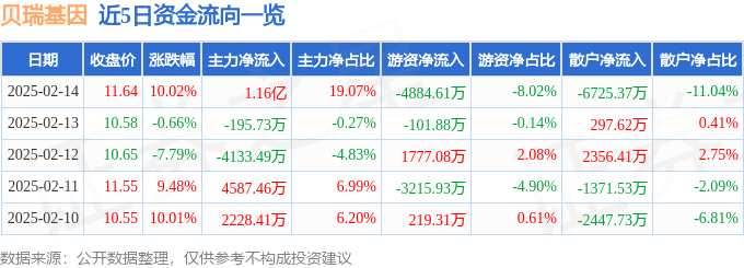 摘要: 消息,貝瑞基因2月14日漲停收盤(pán),收盤(pán)價(jià)11.64元。該股于9點(diǎn)31分漲停,6次打開(kāi)漲停,截止收盤(pán)封單資金為5175.26萬(wàn)元,占其流通市值1.4%。2月14日的資金流向數(shù)據(jù)方面,