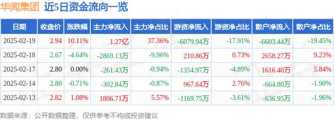 消息,華聞集團2月19日漲停收盤,收盤價2.94元。該股于9點31分漲停,2次打開漲停,截止收盤封單資金為6223.28萬元,占其流通市值1.08%。
