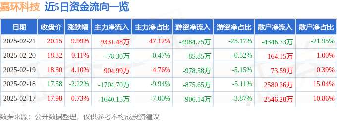 摘要: 消息,嘉環(huán)科技2月21日漲停收盤,收盤價(jià)20.15元。該股于9點(diǎn)30分漲停,未打開漲停,截止收盤封單資金為8819.24萬(wàn)元,占其流通市值5.02%。2月21日的資金流向數(shù)據(jù)方面,