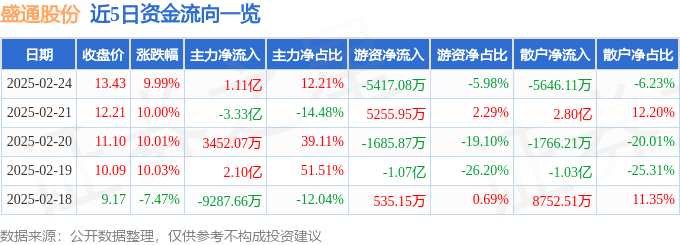 摘要: 消息,盛通股份2月24日漲停收盤,收盤價(jià)13.43元。該股于9點(diǎn)30分漲停,2次打開漲停,截止收盤封單資金為1.74億元,占其流通市值3.21%。2月24日的資金流向數(shù)據(jù)方面,