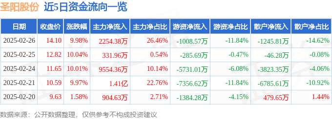 消息,圣陽股份2月26日漲停收盤,收盤價14.1元。該股于9點25分漲停,未打開漲停,截止收盤封單資金為2.08億元,占其流通市值3.26%。