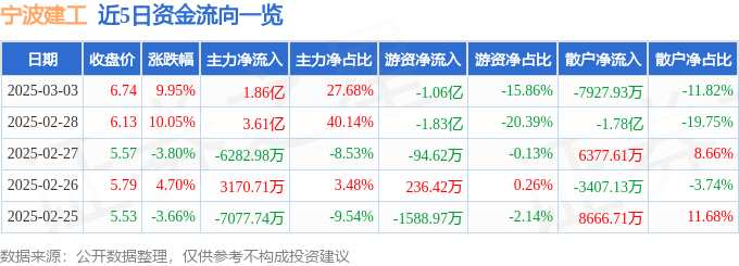 摘要: 消息,寧波建工3月3日漲停收盤,收盤價(jià)6.74元。該股于9點(diǎn)30分漲停,未打開漲停,截止收盤封單資金為2.96億元,占其流通市值4.05%。3月3日的資金流向數(shù)據(jù)方面,主力資金凈流入1.86億元,