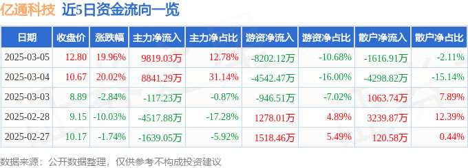 消息,億通科技3月5日漲停收盤,收盤價12.8元。該股于9點32分漲停,1次打開漲停,截止收盤封單資金為5303.71萬元,占其流通市值1.39%。