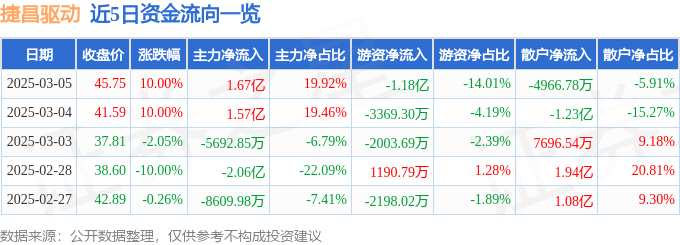 消息,捷昌驅(qū)動3月5日漲停收盤,收盤價45.75元。該股于9點(diǎn)32分漲停,5次打開漲停,截止收盤封單資金為8370.96萬元,占其流通市值0.48%。