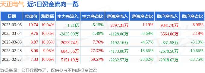 消息,天正電氣3月5日漲停收盤,收盤價10.74元。該股于9點25分漲停,9次打開漲停,截止收盤封單資金為1292.77萬元,占其流通市值0.24%。