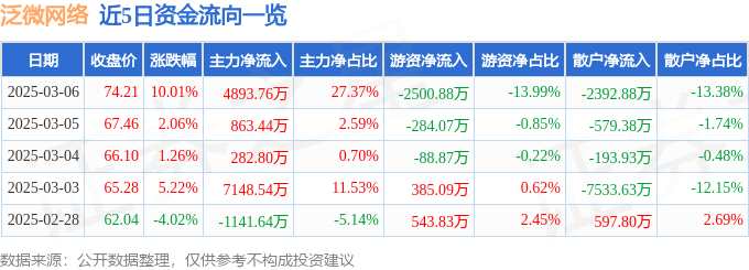 消息,泛微網(wǎng)絡(luò)3月6日漲停收盤,收盤價74.21元。該股于9點25分漲停,未打開漲停,截止收盤封單資金為8472.62萬元,占其流通市值0.44%。