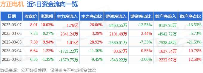 消息,方正電機3月7日漲停收盤,收盤價8.01元。該股于9點31分漲停,4次打開漲停,截止收盤封單資金為5428.47萬元,占其流通市值1.39%。