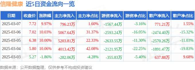 摘要: 消息,信隆健康3月7日漲停收盤,收盤價(jià)7.72元。該股于9點(diǎn)30分漲停,2次打開(kāi)漲停,截止收盤封單資金為2776.81萬(wàn)元,占其流通市值0.99%。3月7日的資金流向數(shù)據(jù)方面,