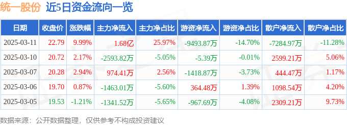 消息,統(tǒng)一股份3月11日漲停收盤(pán),收盤(pán)價(jià)22.79元。該股于9點(diǎn)36分漲停,2次打開(kāi)漲停,截止收盤(pán)封單資金為9620.34萬(wàn)元,占其流通市值2.86%。
