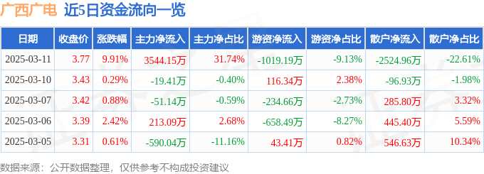 3月11日的資金流向數(shù)據(jù)方面,主力資金凈流入3544.15萬(wàn)元,占總成交額31.74%,游資資金凈流出1019.19萬(wàn)元,占總成交額9.13%,散戶資金凈流出2524.96萬(wàn)元,占總成交額22.61%。