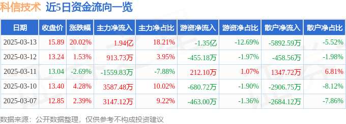 消息,科信技術(shù)3月13日漲停收盤,收盤價(jià)15.89元。該股于9點(diǎn)50分漲停,1次打開漲停,截止收盤封單資金為5952.82萬元,占其流通市值1.65%。