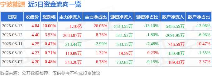摘要: 消息,寧波能源3月13日漲停收盤(pán),收盤(pán)價(jià)4.84元。該股于9點(diǎn)41分漲停,2次打開(kāi)漲停,截止收盤(pán)封單資金為7894.55萬(wàn)元,占其流通市值1.46%。3月13日的資金流向數(shù)據(jù)方面,