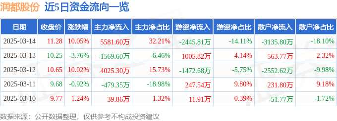 消息,潤都股份3月14日漲停收盤,收盤價11.28元。該股于9點35分漲停,未打開漲停,截止收盤封單資金為3034.73萬元,占其流通市值1.04%。