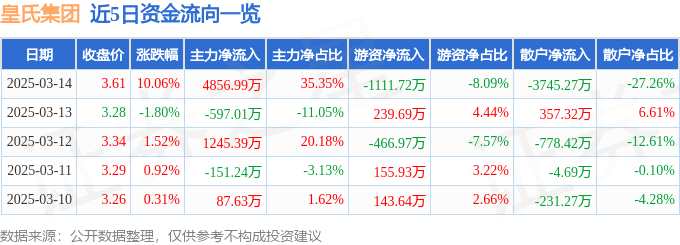 消息,皇氏集團3月14日漲停收盤,收盤價3.61元。該股于9點33分漲停,未打開漲停,截止收盤封單資金為4610.31萬元,占其流通市值1.94%。
