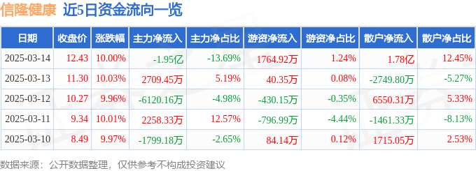 消息,信隆健康3月14日漲停收盤(pán),收盤(pán)價(jià)12.43元。該股于9點(diǎn)25分漲停,未打開(kāi)漲停,截止收盤(pán)封單資金為5903.32萬(wàn)元,占其流通市值1.3%。