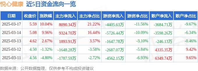 消息,悅心健康3月17日漲停收盤,收盤價(jià)5.59元。該股于9點(diǎn)31分漲停,未打開漲停,截止收盤封單資金為1.66億元,占其流通市值3.23%。