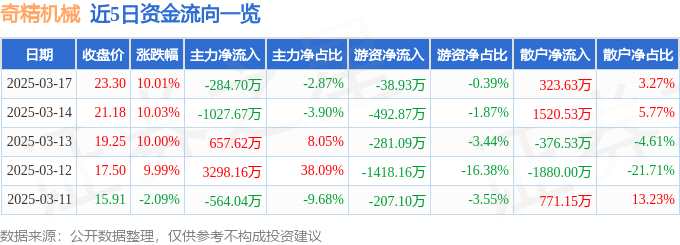 消息,奇精機械3月17日漲停收盤,收盤價23.3元。該股于9點25分漲停,未打開漲停,截止收盤封單資金為1.01億元,占其流通市值2.25%。