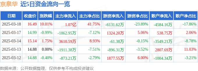 摘要: 消息,京泉華3月18日漲停收盤(pán),收盤(pán)價(jià)16.49元。該股于9點(diǎn)30分漲停,未打開(kāi)漲停,截止收盤(pán)封單資金為1.16億元,占其流通市值3.03%。3月18日的資金流向數(shù)據(jù)方面,主力資金凈流入1.07億元,
