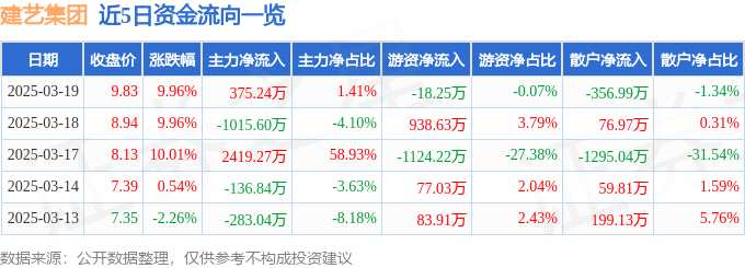 消息,建藝集團(tuán)3月19日漲停收盤,收盤價(jià)9.83元。該股于9點(diǎn)36分漲停,1次打開漲停,截止收盤封單資金為971.17萬(wàn)元,占其流通市值0.75%。
