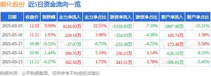 摘要: 消息,醋化股份3月19日漲停收盤,收盤價(jià)12.22元。該股于9點(diǎn)34分漲停,1次打開漲停,截止收盤封單資金為2061.15萬(wàn)元,占其流通市值0.82%。3月19日的資金流向數(shù)據(jù)方面,
