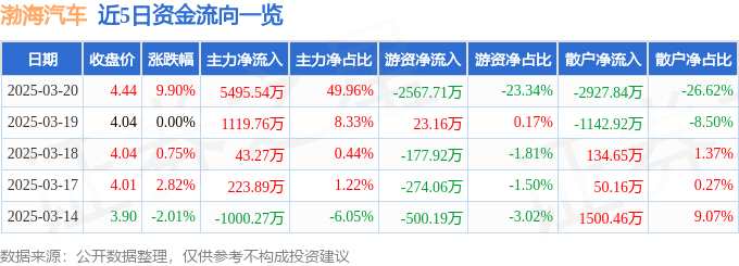 摘要: 消息,渤海汽車3月20日漲停收盤,收盤價(jià)4.44元。該股于9點(diǎn)31分漲停,未打開漲停,截止收盤封單資金為3239.63萬(wàn)元,占其流通市值0.77%。3月20日的資金流向數(shù)據(jù)方面,