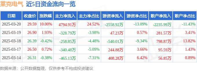 消息,萊克電氣3月20日漲停收盤,收盤價(jià)29.59元。該股于9點(diǎn)30分漲停,2次打開漲停,截止收盤封單資金為5341.42萬元,占其流通市值0.32%。