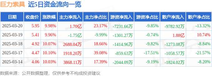 消息,巨力索具3月20日漲停收盤,收盤價5.95元。該股于9點32分漲停,1次打開漲停,截止收盤封單資金為1.47億元,占其流通市值2.59%。