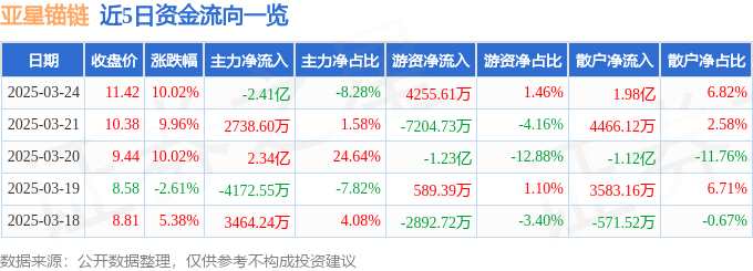 消息,亞星錨鏈3月24日漲停收盤(pán),收盤(pán)價(jià)11.42元。該股于9點(diǎn)30分漲停,3次打開(kāi)漲停,截止收盤(pán)封單資金為3321.53萬(wàn)元,占其流通市值0.3%。