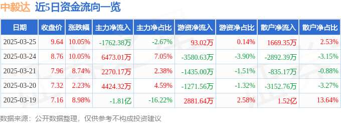 消息,中毅達(dá)3月25日漲停收盤,收盤價(jià)9.64元。該股于9點(diǎn)33分漲停,1次打開漲停,截止收盤封單資金為8491.61萬元,占其流通市值1.24%。