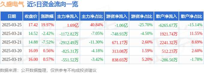 消息,久盛電氣3月25日漲停收盤,收盤價17.42元。該股于9點31分漲停,未打開漲停,截止收盤封單資金為1.67億元,占其流通市值8.95%。